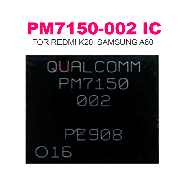 PM7150 002 IC is a Qualcomm Power Management Integrated Circuit (PMIC) used in smartphones and other mobile devices to control and distribute power. Like Xiaomi Redmi K20, Samsung A80
